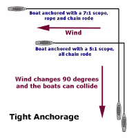 5:1 or less scope and have a smaller swinging radius than a boat with a