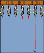 Tip: One may place a second line (trip line) to the head of the anchor. There is usually a metal loop to allow for the placement. Bring the line up to the surface and attach to a flotation device. Using this line the anchor can be pulled out by its head and will be easy to remove. The length of the trip line is equal to the water depth at high tide plus 5 to 10 feet.